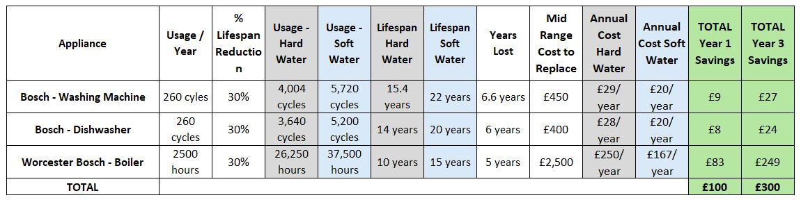 It is quite well documented that hard water is likely to reduce the lifespan of your boiler by 50%, however having looked at specific manufacturer data most boilers come with a 10-year warranty, so we have kept this to 30% for each appliance to give an accurate picture of costs. You can see here that annual costs for the three most common appliances are £100.