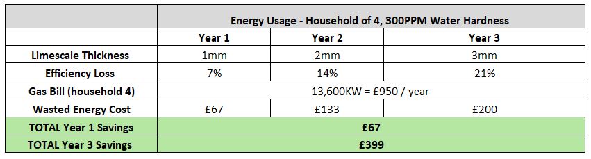 In the case of heating efficiency, this cost compounds over the years with the millimetres of limescale built up. An estimate of 13,600KW/year costs £950 for a household of 4. This table shows how cumulatively this household’s ‘hard water tax’ would be £399 by the end of year 3.